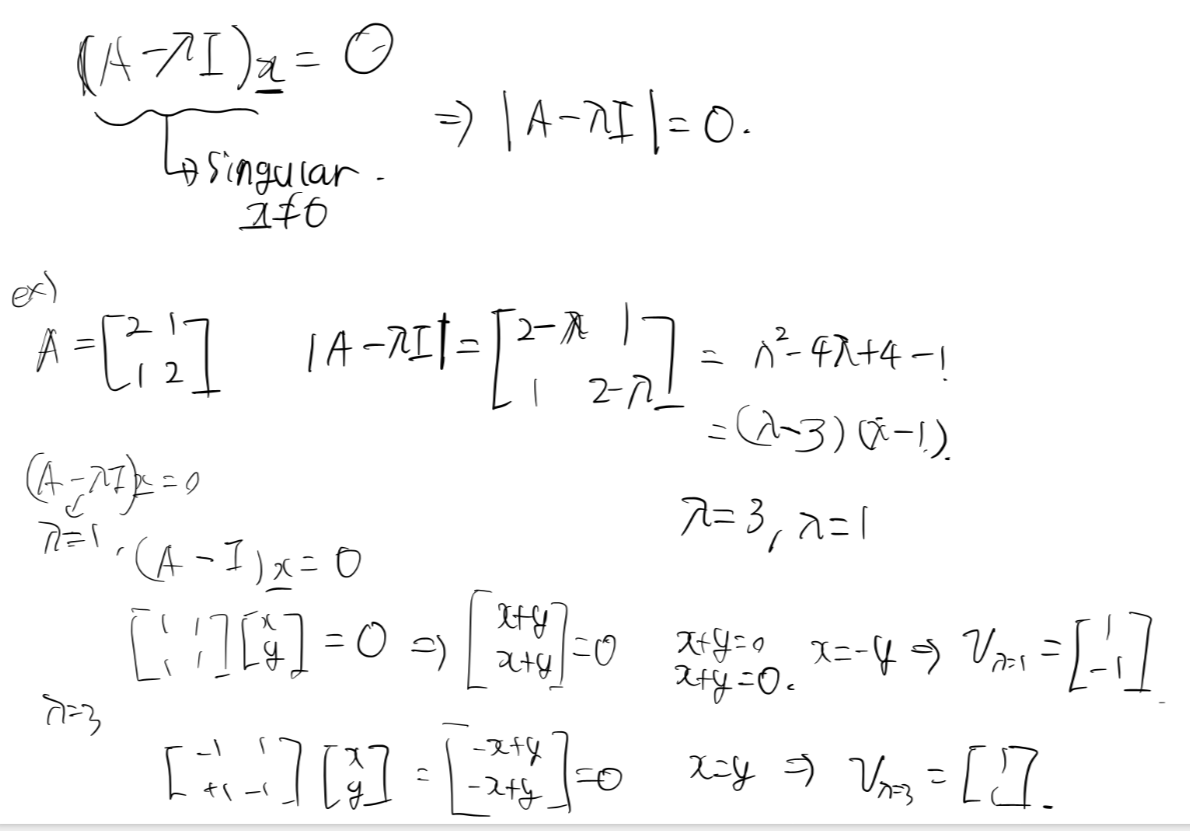 고유벡터를 구하는 법은 | A - λI | = 0 을 해주면 λ값들이 나옵니다.