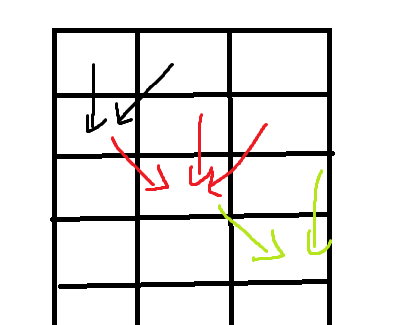 맨 위 부터 출발 하여 내려오는데 바로 아래와 한 칸 대각선으로만 이동 가능함.