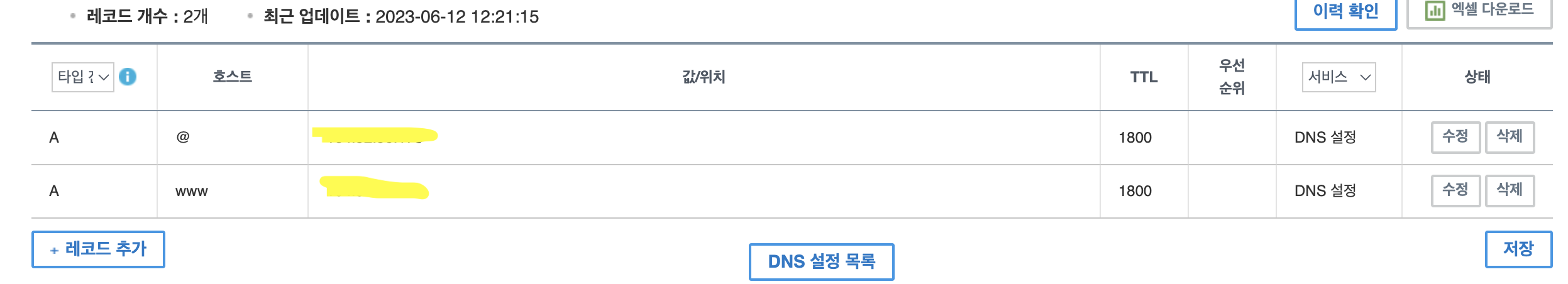 두번째줄은 호스트부분에 www 넣어주고 똑같이 그다음은 public ip를 넣어주면됨 그리고 상태쪽에 확인 버튼 눌러줘( 위 그림에는 수정이라고 되어있어)