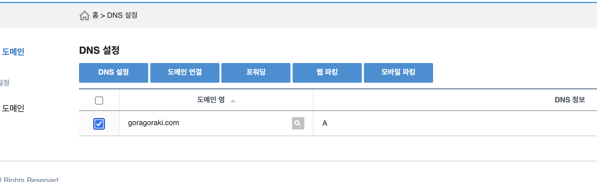 자신의 도메인 체크 박스 누룬다음 DNS 설정 클릭