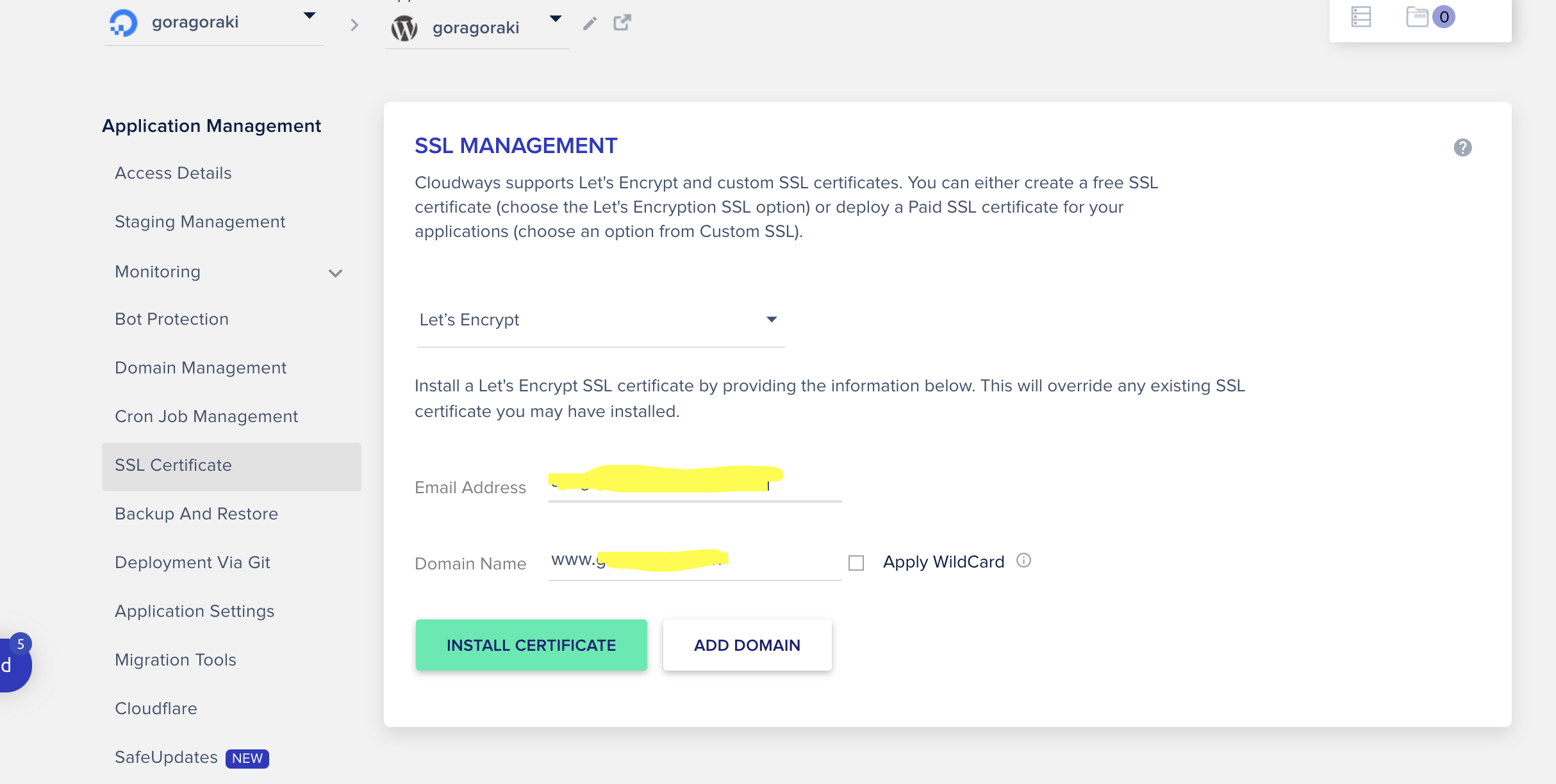 이런 화면이 뜨거든? 여기서 자기 이메일 주소하고 그 밑에는 도메인 주소를 입력하고 INSTALL CERTIFICATE을 클릭됨 시간 좀 걸림