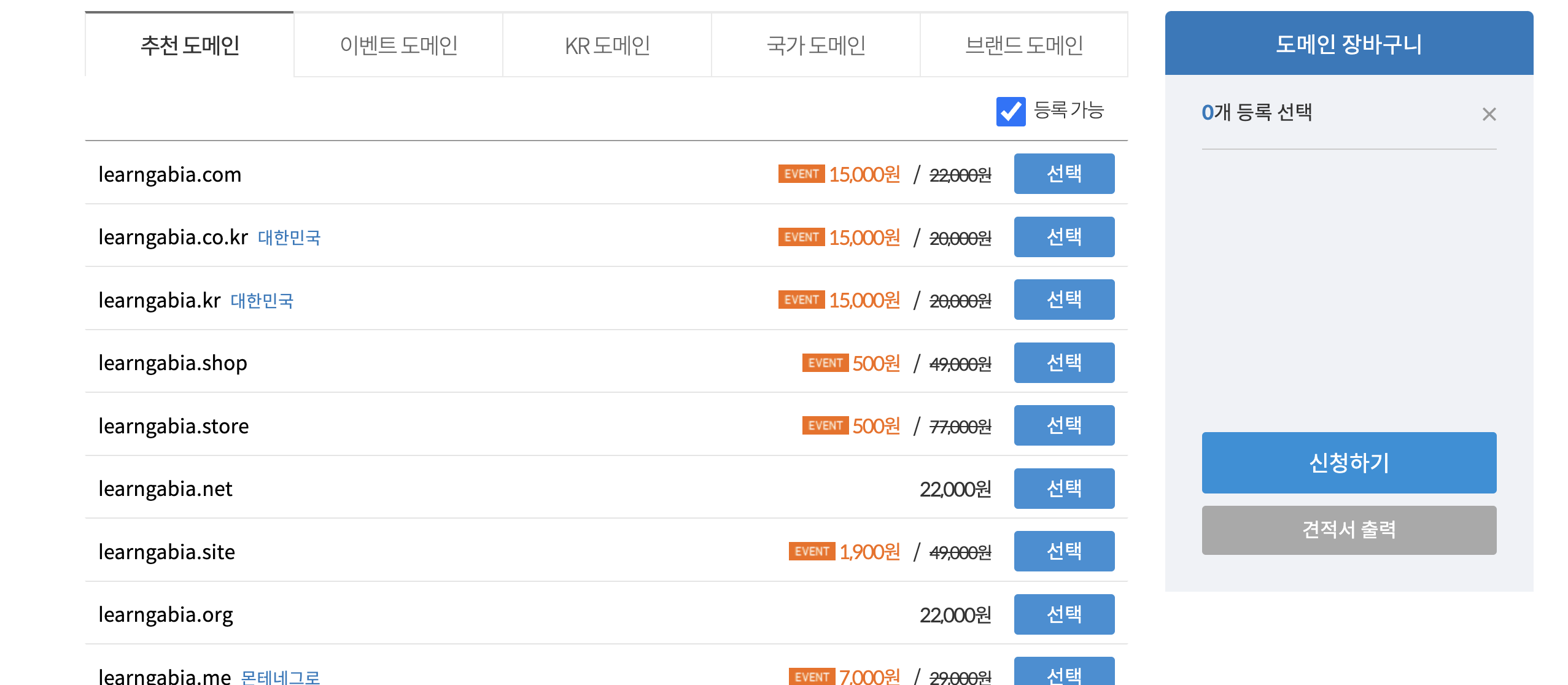 그럼 이런식으로 가능한 도메인이 뜰거야 여기서 원하는거 선택하고 신청하기 버튼 클릭해줘