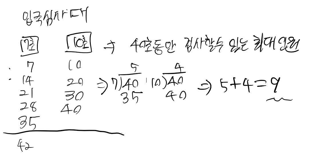 그래서 고민 좀 많이 하고 생각을 바꿔서 시간을 기준으로 해서 각 시간마다 얼만큼의 사람을 통과시킬 수 있는지로 구현을 하여서 심사할 수 있는 인원의 조건을 만족하는 시간 중에서 최소값을 찾아주는 식으로 구현하였다.