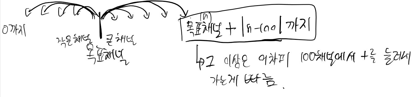 이 두개의 결과와 100번에서 그냥 + or -를 눌러서 갈 수 있는 수를 비교해주면 끝이다.