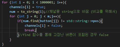 그래서 없는 버튼이 들어가있는 채널에는 false 넣어준다. 이 때 버튼이 있는지 없는지를 확인하는 방법은 채널을 string으로 바꾸어주고 처음에 버튼을 입력받을 때 char로 입력을 받아 string의 find 함수를 통해서 채널에 없는 버튼이 포함이 되어있는지 확인하는 방법으로 구현해주었다.