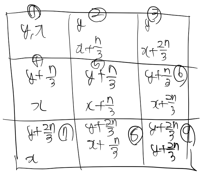 보면 처음에 9로 시작한다. 모든 원소가 같지 않다면 n/3으로 나누고 각 분면의 시작 좌표로 이동해주어야한다.