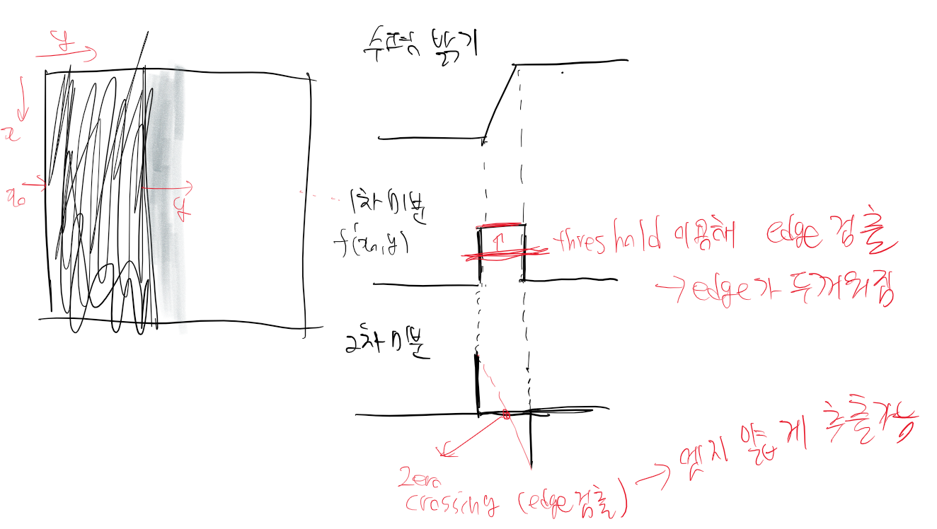 그림과 같이 2차 미분을 이용한 경계값 추출은 엣지를 얇게 추출이 가능하다.