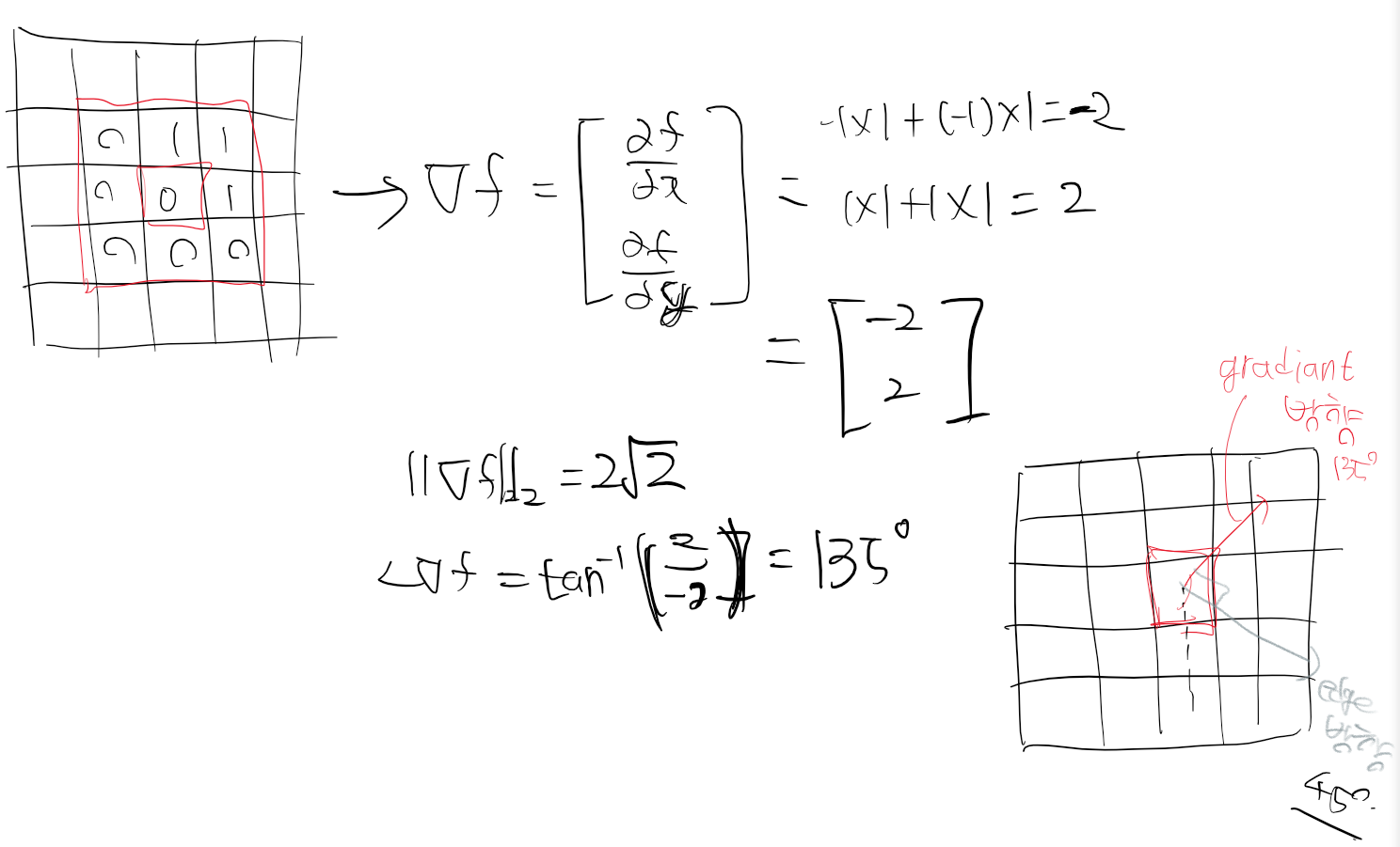 벡터의 크기를 구하면 얼마나 밝은지에 대한 값이고 아크 탄젠트를 구해주면 X축과 이루는 각 즉, gradiant의 방향을 알 수 있게 되는데 90도에서 이 방향을 빼주면 edge의 방향을 구할 수 있다.
