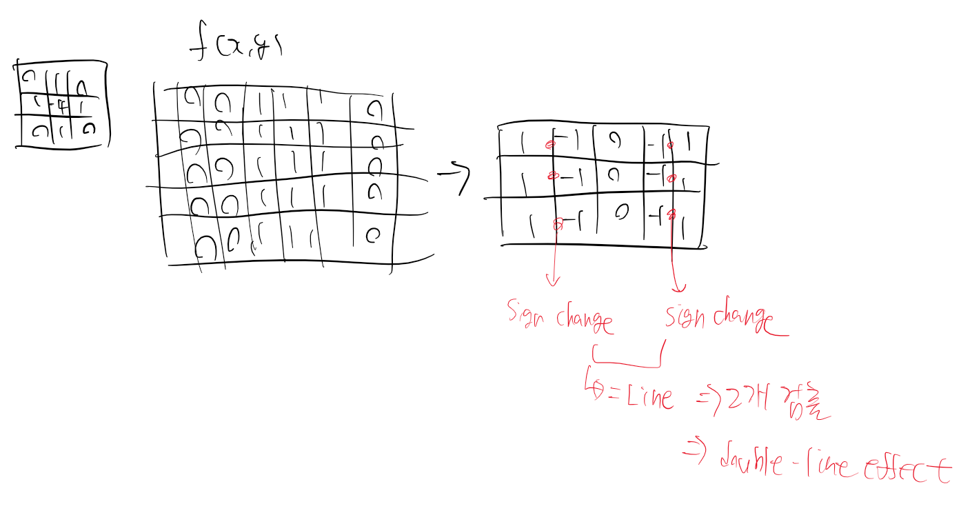 선이기 때문에 부호가 바뀌는 구간이 2개가 검출되어지게 된다. 이것을 double-line effect라고 한다. 이것을 해결하기 위해서는 양에서 음수 혹은 음수에서 양으로 가는 것을 하나만 선택해주면 보다 얇은 엣지를 추출할 수 있게 된다. 그렇기 때문에 2차 미분을 이용한 마스크를 사용하면 1차 미분을 한 마스크 보다 얇은 엣지를 추출할 수 있게 된다.