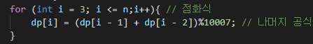 dp[i] = (dp[i - 1] + dp[i - 2])%10007; // 나머지 공식