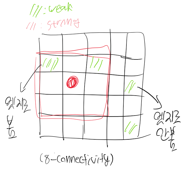 아까 얻어진 strong edge와 weak edge가 연결되어있는지 확인 후 weak edge를 엣지로 볼지 아닐지를 판단해주는 것이다.