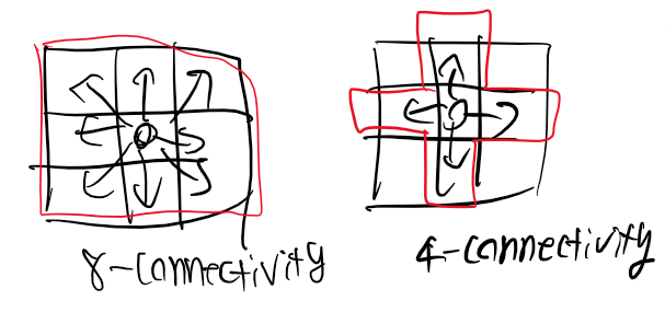 8-connectivity는 8방향으로 연결되어있는지 보는 것이고 4-connectivity는 4방향을 보는 것이다.