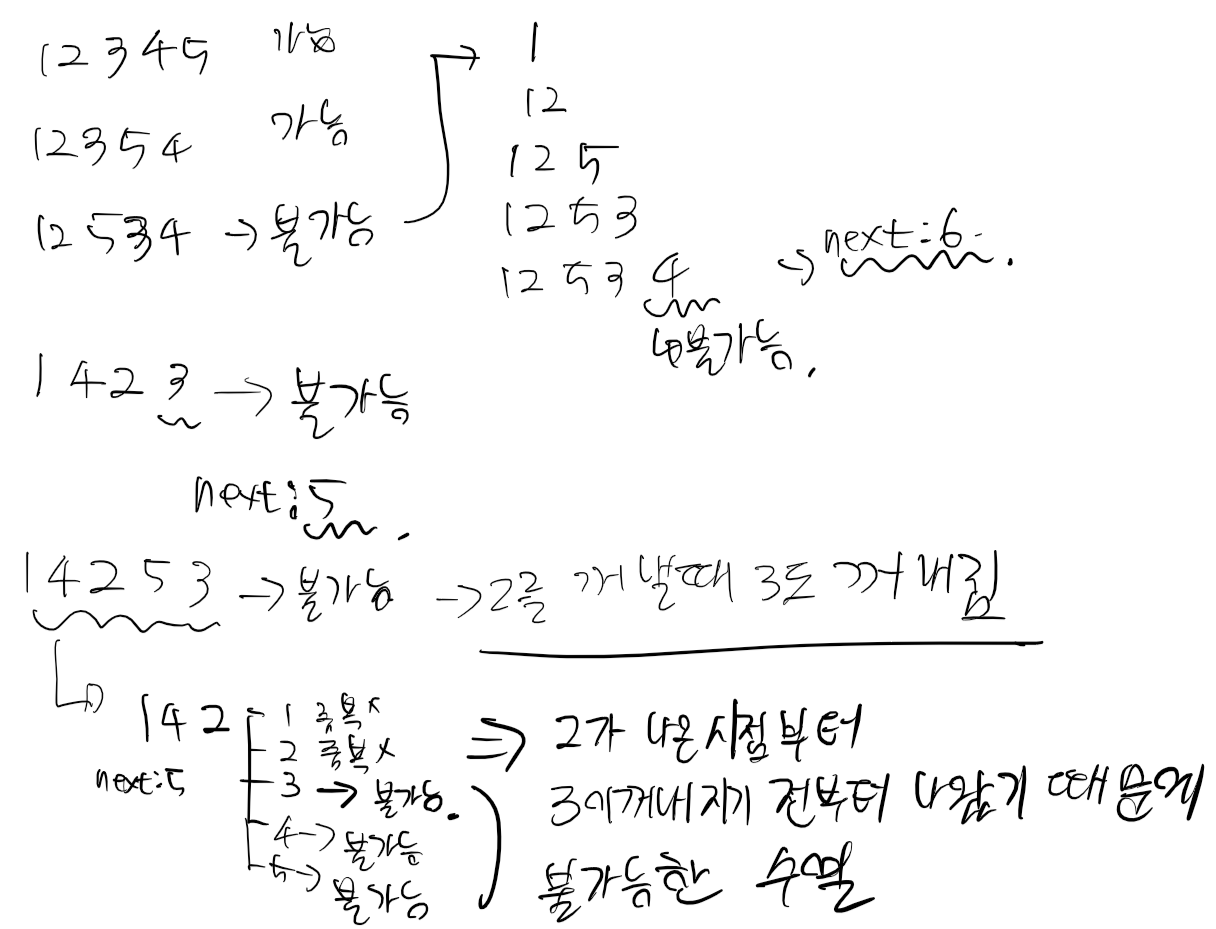 이러한 각 자리에 수가 들어가서 수열이 가능한 경우 그 위치의 수가 next보다 작으면 next는 그대로 유지 해주고 만약 크거나 같다면 next에 +1을 해주어야한다.