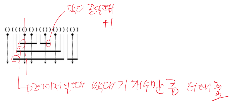 이것을 이용하여 ( 나올때 카운트를 해준다. 그리고 ) 나왔을 때 (하나는 사라지는 것이므로 카운트 개수를 -1해준다.