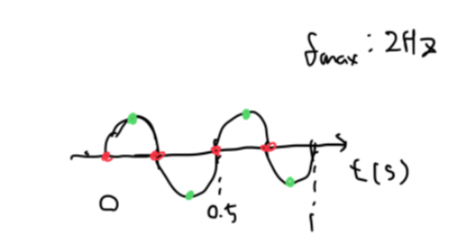 자 이런 신호가 있을 때 최대 주파수가 2Hz이고 샘플링 주파수가 4Hz일 때 초록색 점처럼 샘플링을 했다면 나중에 원래 신호로 복원할 수 있지만 만약 우연하게 빨간색 점처럼 샘플링 하게 되면 원래 신호로 복원을 할 수가 없기 때문에 엄밀히 따지면 2배 보다 조금이라도 크게 해야합니다. 근데 많은 사람들이 최대 주파수의 2배로 해도 문제가 없다라고 말합니다. 왜냐하면 실제 우리가 샘플링할 때 이렇게 딱 완전한 사인웨이브가 아니라 복잡한 신호이고 하필 딱 저렇게 샘플링하게 될 확률이 엄청 작기 때문에 2배 이상으로 해도 문제 없다라고 할 수 도 있지만 엄밀히 말하면 2배 초과가 맞다고 할 수 있습니다.