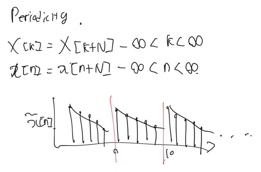 그런데 DFT를 적용할 때는 오리지널 신호가 비주기 신호여도 주기 반복 된 신호라고 생각해주어야 합니다. 왜냐하면 주파수 도메인에서 샘플링이 일어났기 때문에 타임 도메인에서는 주기 반복이 일어나기 때문에 실제 있는 신호는 주기 반복 신호라는 것입니다. 그래서 만약 10-point DFT를 했다고 하면 10만큼 간격으로 주기 반복되는 신호가 있다고 생각해주어야합니다.