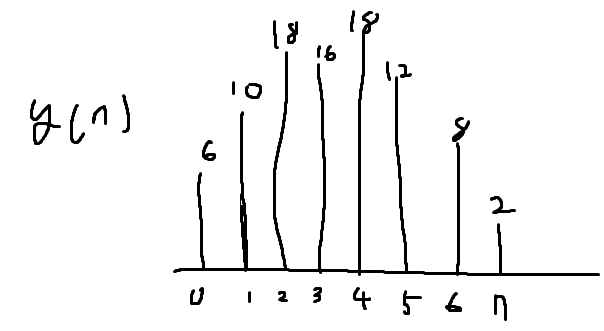 y[0] = h[-n]을 x[n]에 곂쳤을 때 곂치는 것을 곱해주고 더해주면된다. 즉, 3*2 = 6