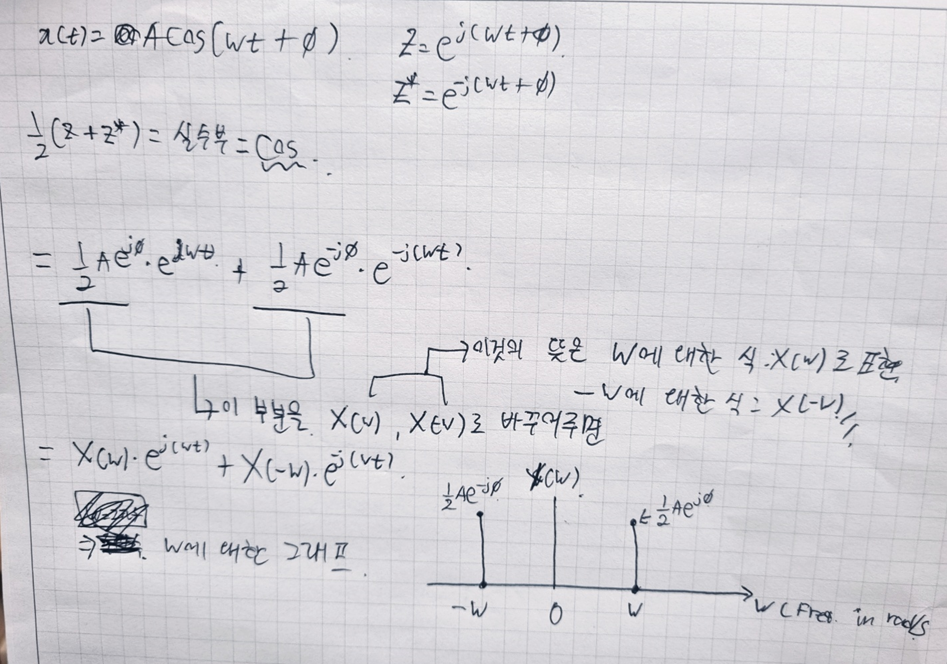 그래서 우리는 sinusoid를 두 개의 complex exponentials로 나타낼 수 있고 이것을 w축을 이용해서 나타내주는 것이 바로 frquency spectrum 이라고 합니다.